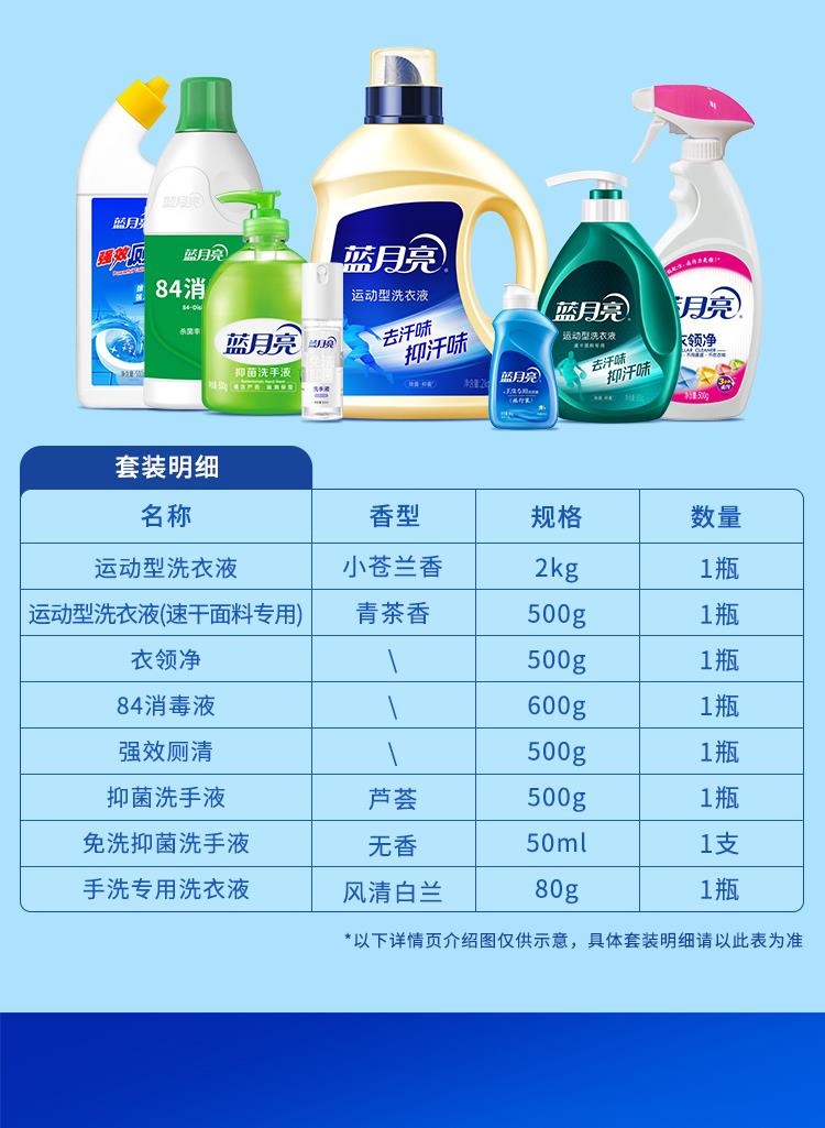蓝月亮洗护家清组合2(2kg运动洗+500g速干+500g衣领净+600g84消毒液+500g厕清+500g芦荟洗手液+50ml免洗+80g手洗)81000739
