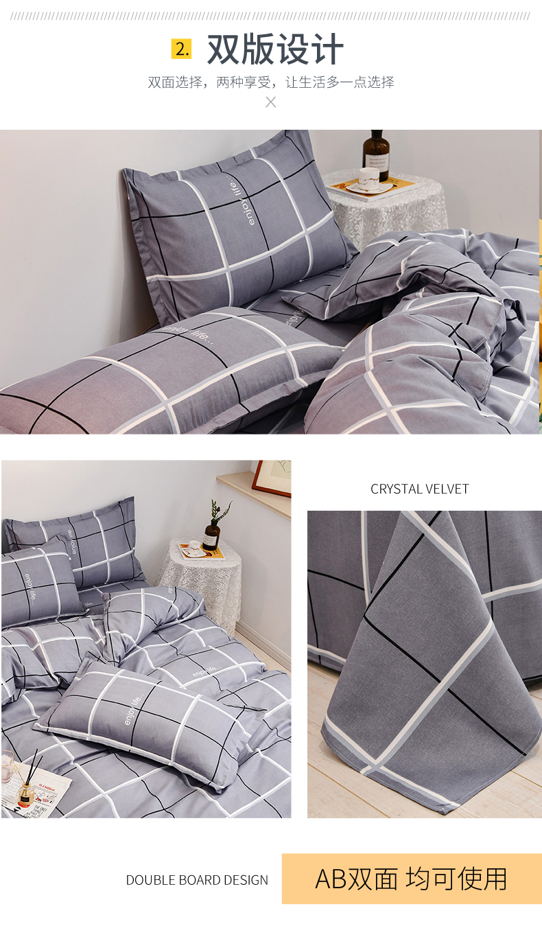 舒适的面料,亲肤又透气,在夜晚给你最温柔的守护!躺上去,钻进被窝,就像被轻轻柔柔包裹着的感觉,触感软滑,十分亲肤细腻,一觉睡到天亮。小清新印花四件套面料厚实,做过缩水处理,面料挺括弹性强。一套的价格,两套享受,随你的心情自由切换!