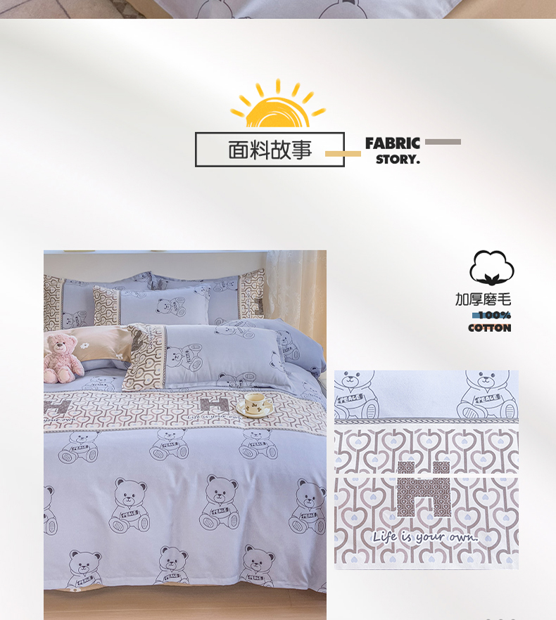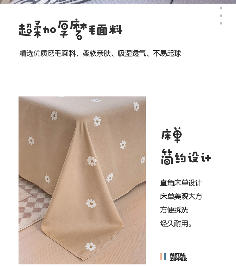 舒适的面料,亲肤又透气,在夜晚给你最温柔的守护!钻进被窝,就像被轻轻柔柔包裹着的感觉,触感软滑,十分亲肤细腻。拥抱这套磨毛四件套,就像投入了云朵的怀抱。在这个季节,给床铺添上一份温暖的守护,加厚不是为了隔离寒冷,而是为了拥抱舒适的冬日暖阳,每一根细丝都经过磨毛处理磨毛四件套面料厚实,做过缩水处理,面料挺括弹性强。