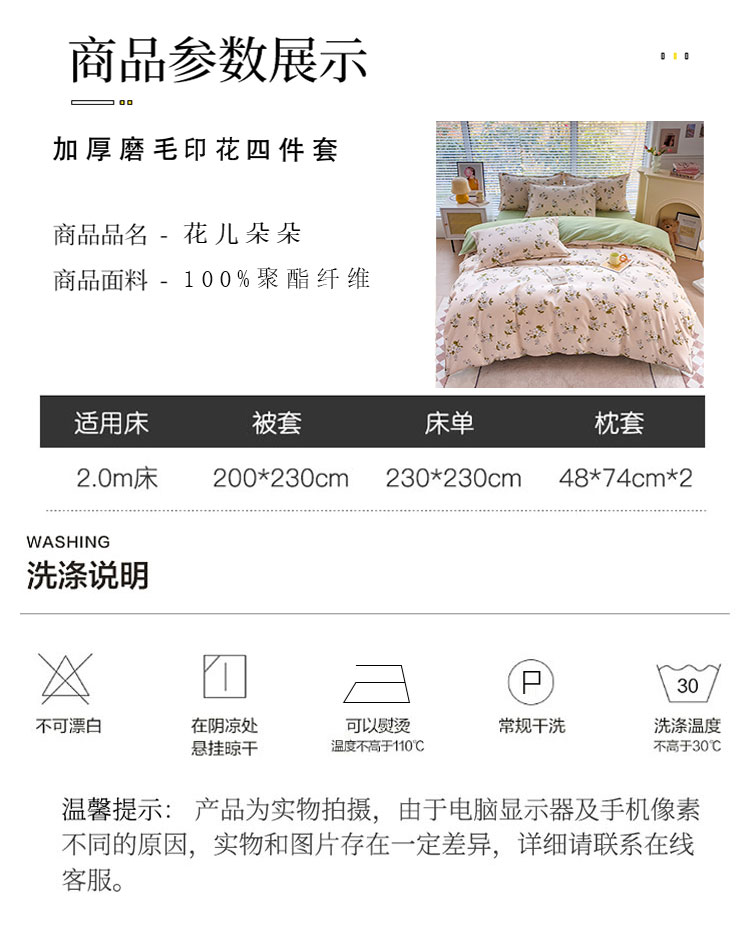 "每一根细丝都经过磨毛处理,面料厚实,做过缩水处理,面料挺括弹性强。拥抱这套磨毛四件套,就像投入了云朵的怀抱。磨毛面料结构紧密,抗起球、耐洗涤,久用不易变形、褪色,经得住日常频繁使用,长久保持良好品相,性价比出色 。