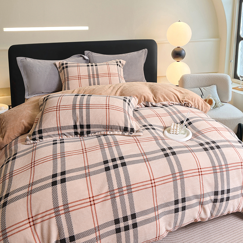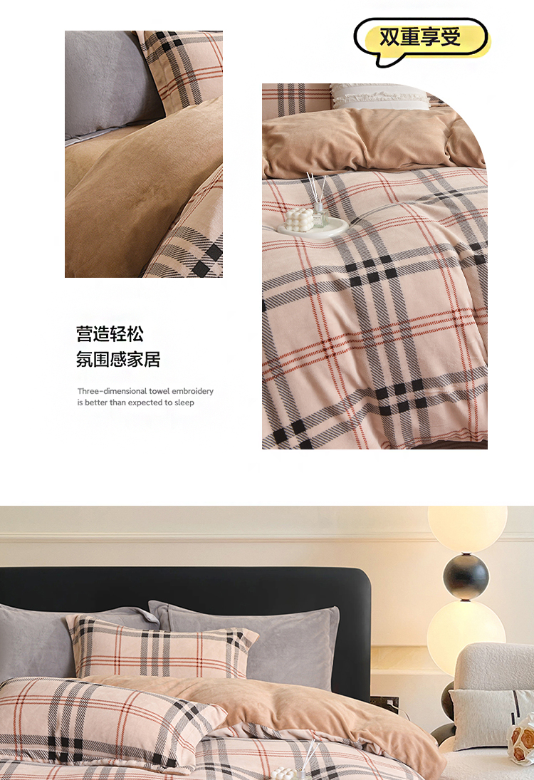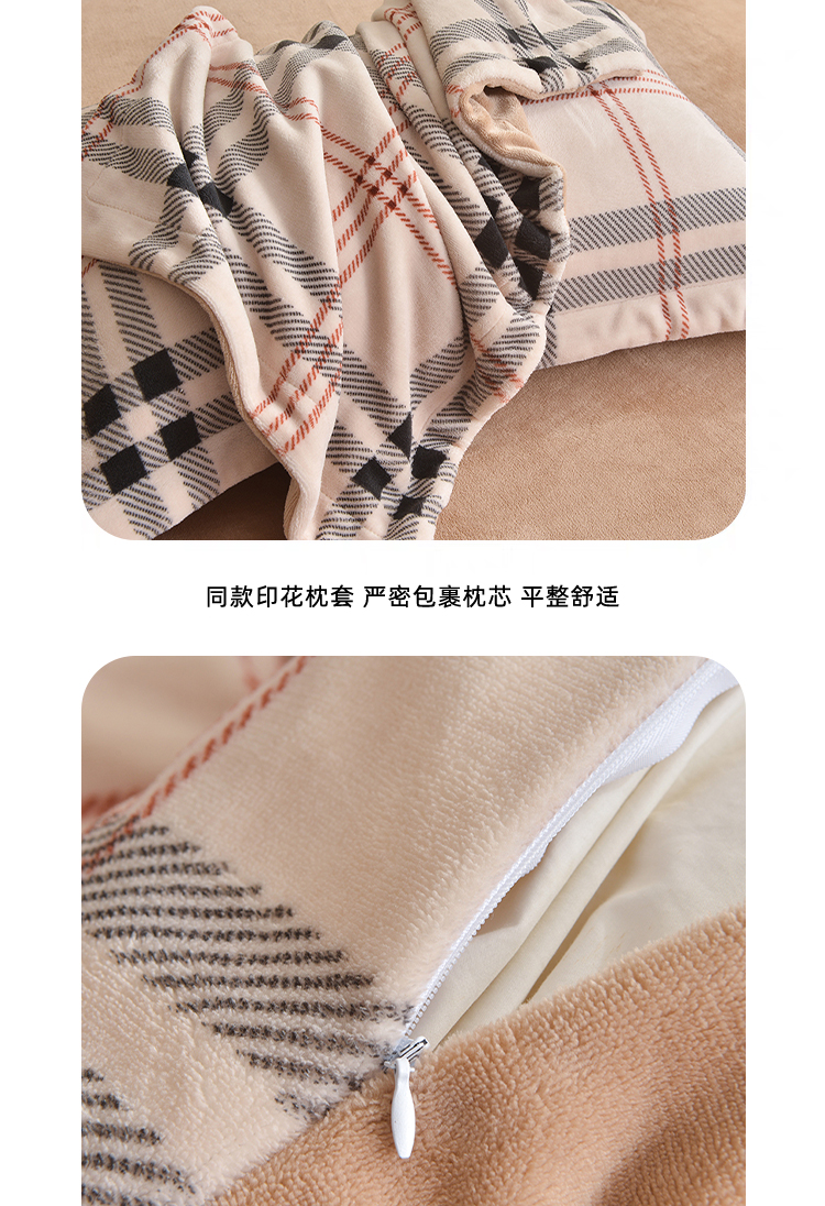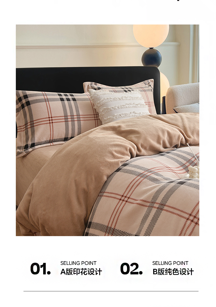 锁温黑科技:100%聚酯纤维+加厚拉绒工艺,形成密集保暖层,有效阻隔冷空气,整夜恒温不冰凉。经典拼色格纹(宝格丽经典色),复古与现代交融,轻松适配北欧、ins风卧室,视觉温暖感+50%。裸睡级触感:双面加密绒毛,柔软蓬松不扎肤,静电处理后贴身不粘毛,秋冬贴身更安心。