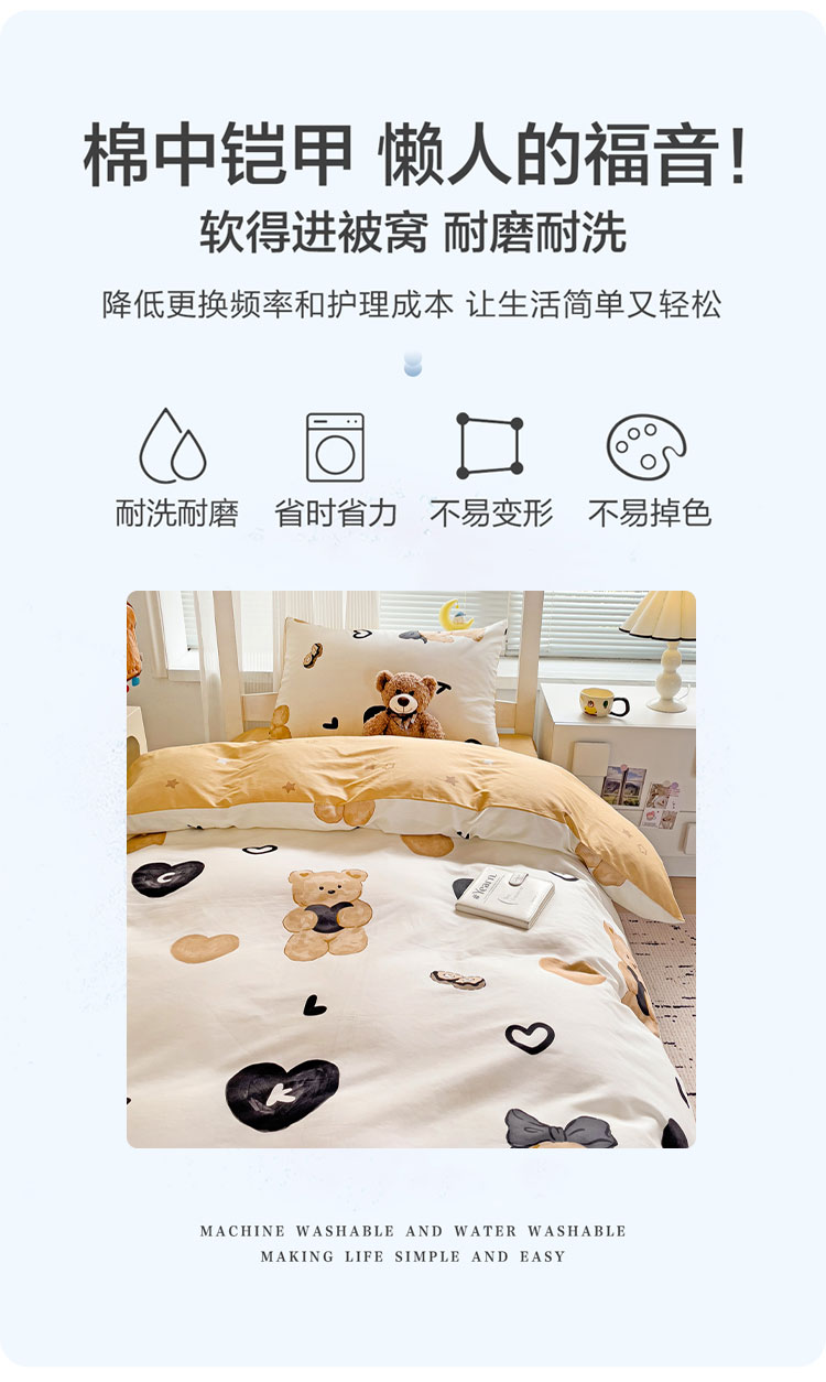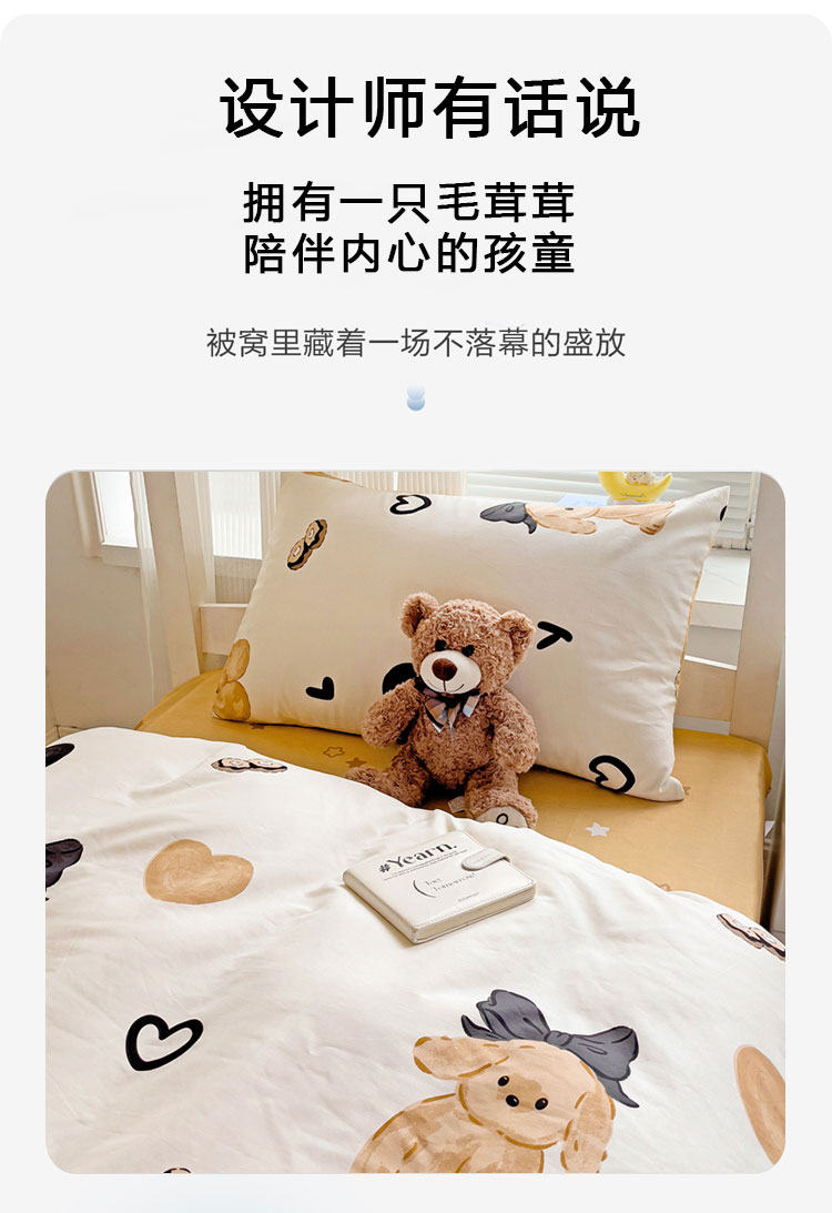 100%全棉材质,柔软透气,无化学添加,呵护宝宝娇嫩肌肤;卡通主题印花+鲜活色彩激发童趣,培养自主入睡习惯。隐形拉链、弹性包边等实用细节防移位,抗菌枕套守护呼吸健康。四季通用,机洗抗皱不褪色,高性价比省心省力!安全、舒适、趣味兼具,一套搞定儿童房萌化改造,守护宝宝甜美梦乡,宝妈育儿更轻松!