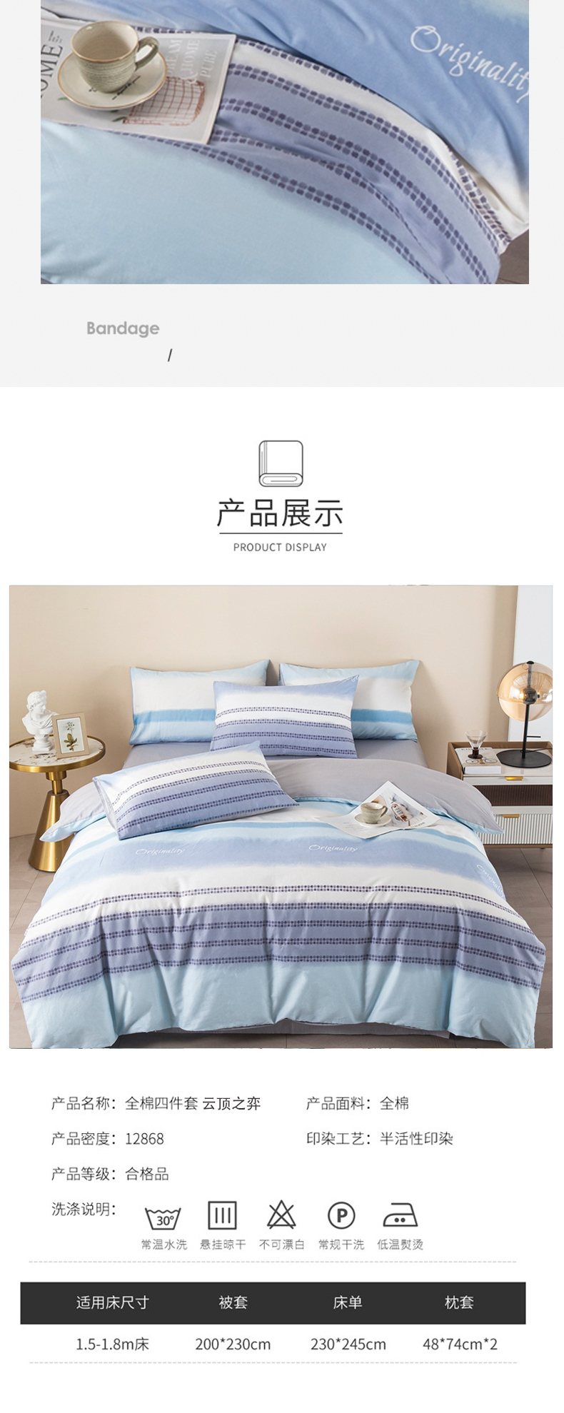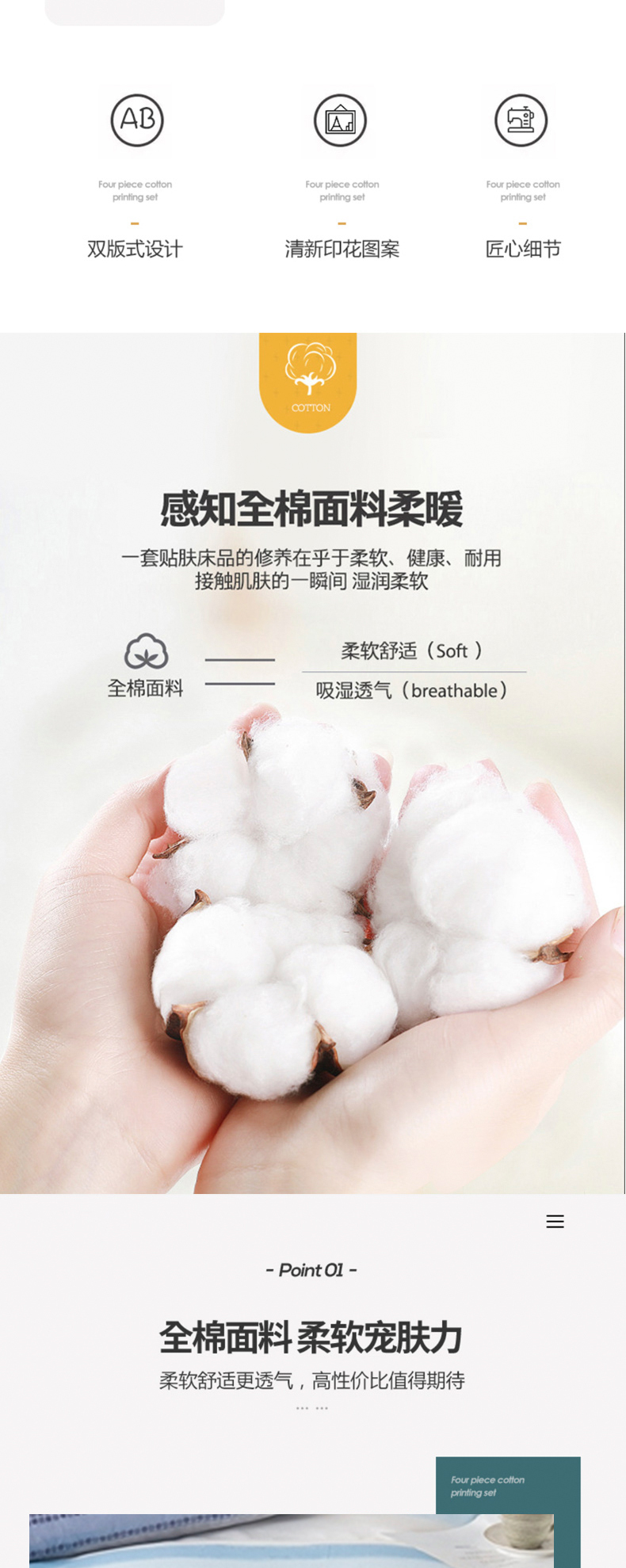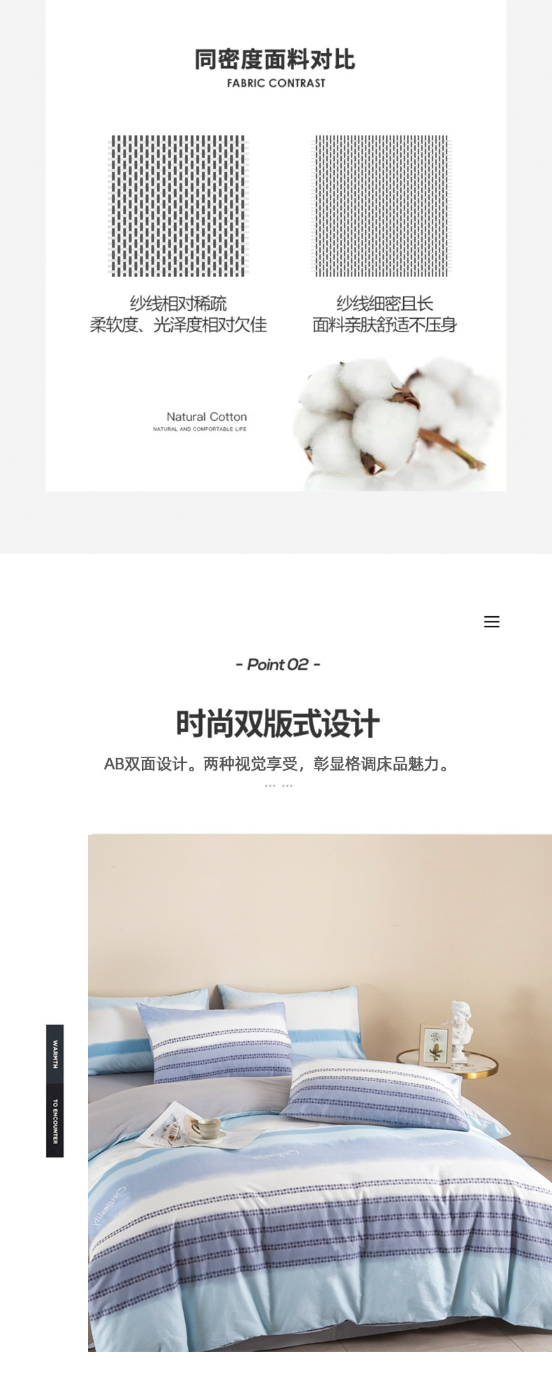 100%全棉材质,阳光全棉,40支纱倾心织造,触感柔软舒适,体感细腻亲肤 ,透气性优越,美观耐用,深受人们的喜爱。