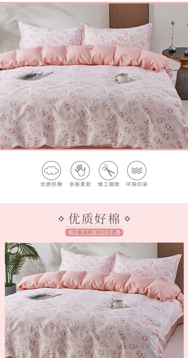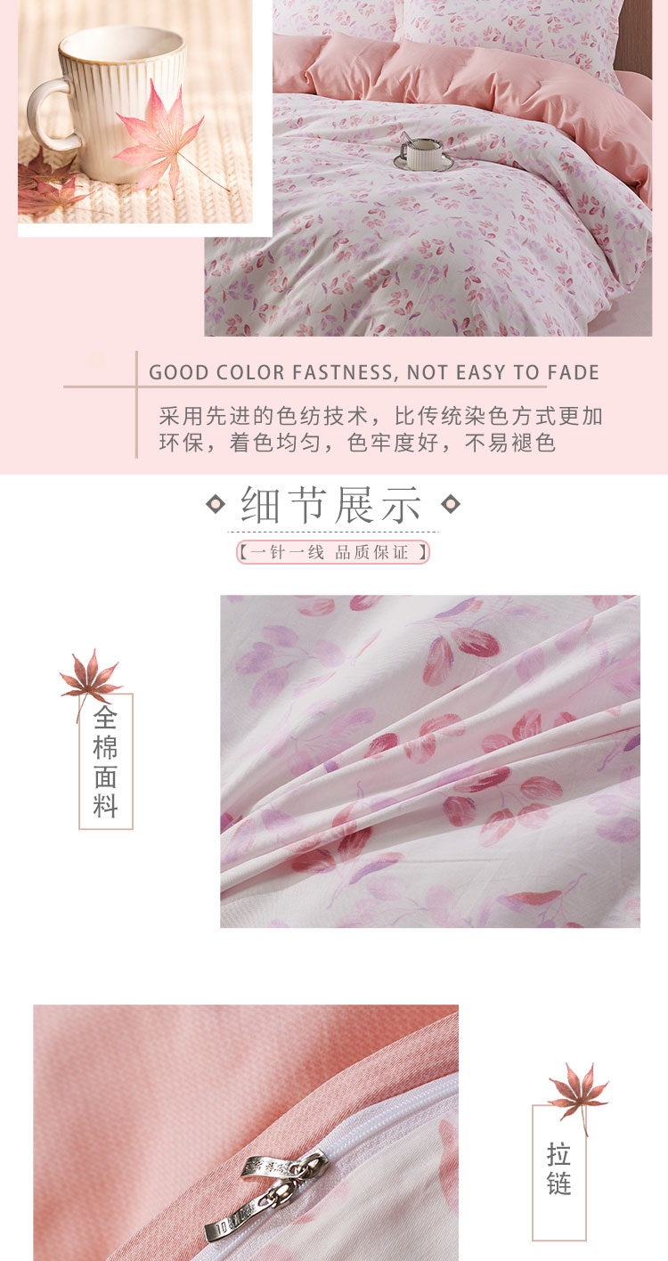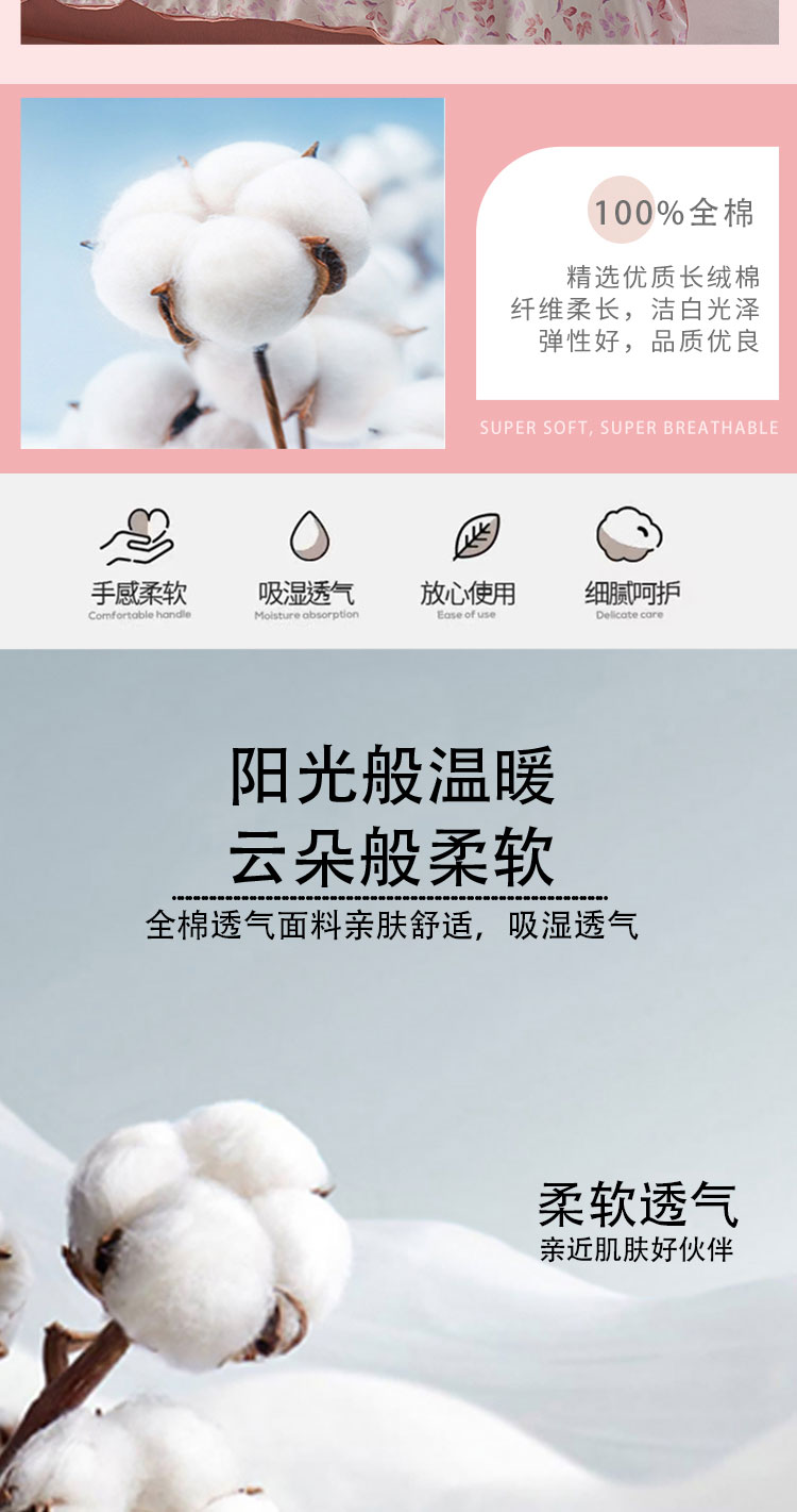 "100%全棉材质,阳光全棉,40支纱倾心织造,触感柔软舒适,体感细腻亲肤 ,透气性优越,美观耐用,深受人们的喜爱。