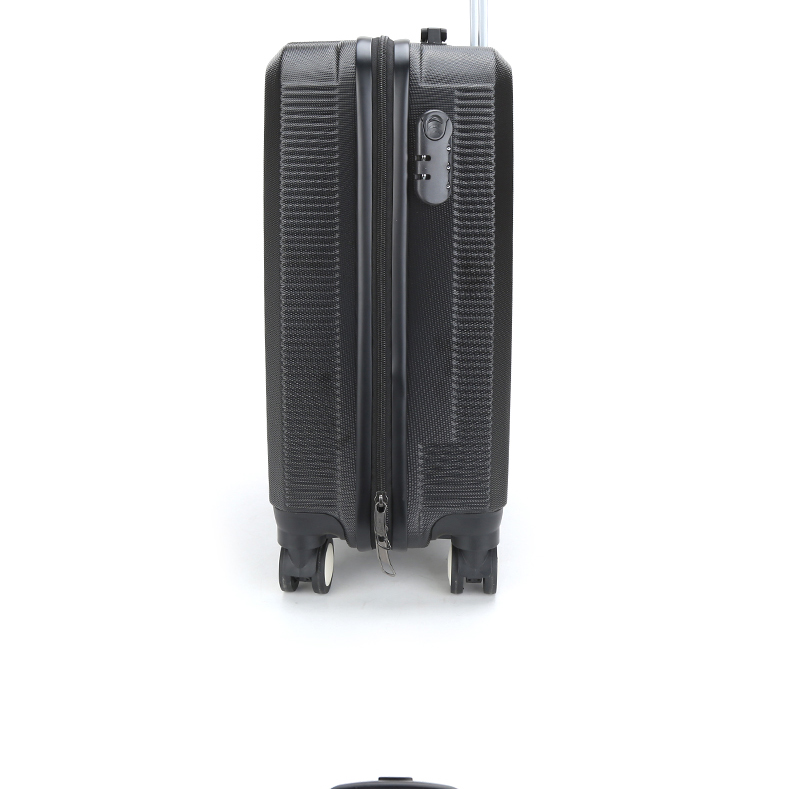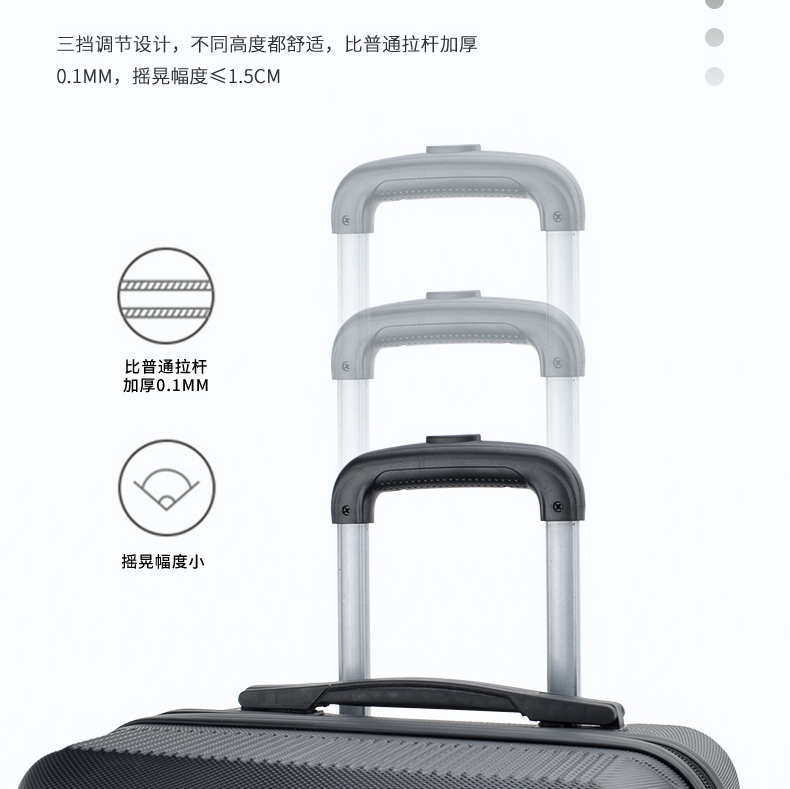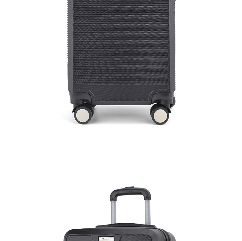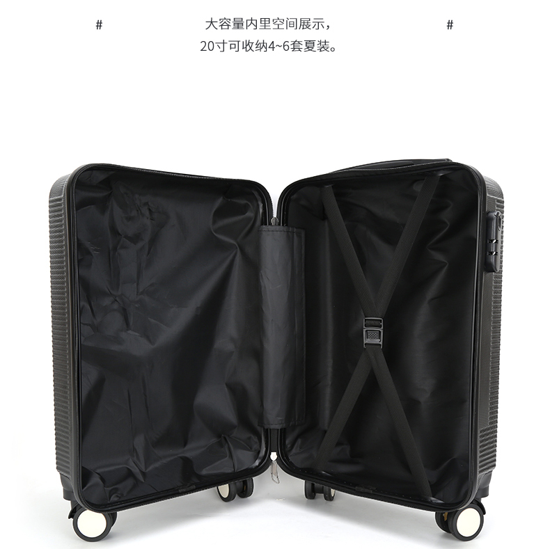 本产品采用ABS材料精心制作而成,前幅图案设计新颖,并设有品牌五金标志.易设易调的3位数密码锁.经久耐用不易变形的铁拉杆.万向飞行轮.柔软耐用的手提.内层还设置有X型物品固定带.内里布局简单明了、易放易拿更便捷.